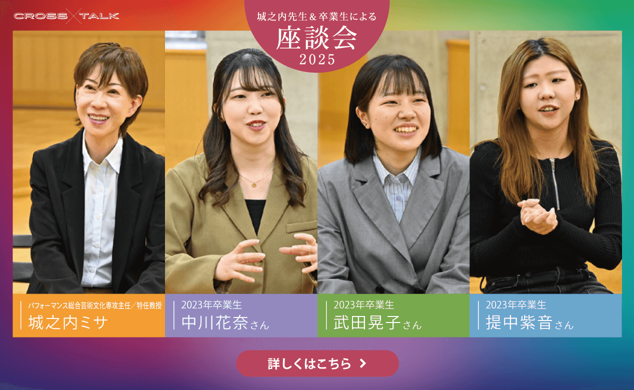 ●音楽クリエーター ●音楽プロデューサー・ディレクター ●アニメプロデューサー ●イベントプロデューサー・ディレクター ●芸能マネージャー ●音楽系ライター ●舞台芸術家(演出・俳優・舞台監督・舞台美術) ●ステージマネージャー ●声優・俳優・アナウンサー ●脚本家 ●音楽評論家 ●アニソン作曲家 ●作詞家 ●アート・マネジメント関係専門職 ●広告代理店 ●プロモーション会社 ●テレビ制作会社 ●企業(放送・映像・芸能・広告) ●旅行代理店 ●国際文化交流団体等 ●海外芸術系大学・大学院留学 ●国内大学院進学 他