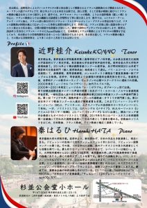 テノール:近野 桂介(本学大学院修了生) ピアノ:秦 はるひ(本学特任教授)