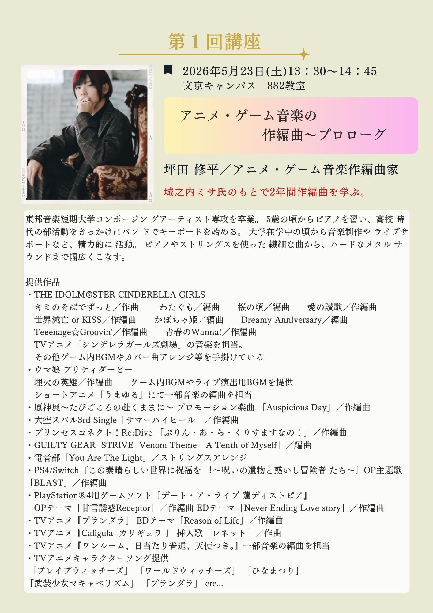 5月23日(土) 「アニメ・ゲーム音楽の作編曲〜プロローグ」 講師:坪田修平/アニメ・ゲーム音楽作編曲家 申込締切:5月20日(水) |