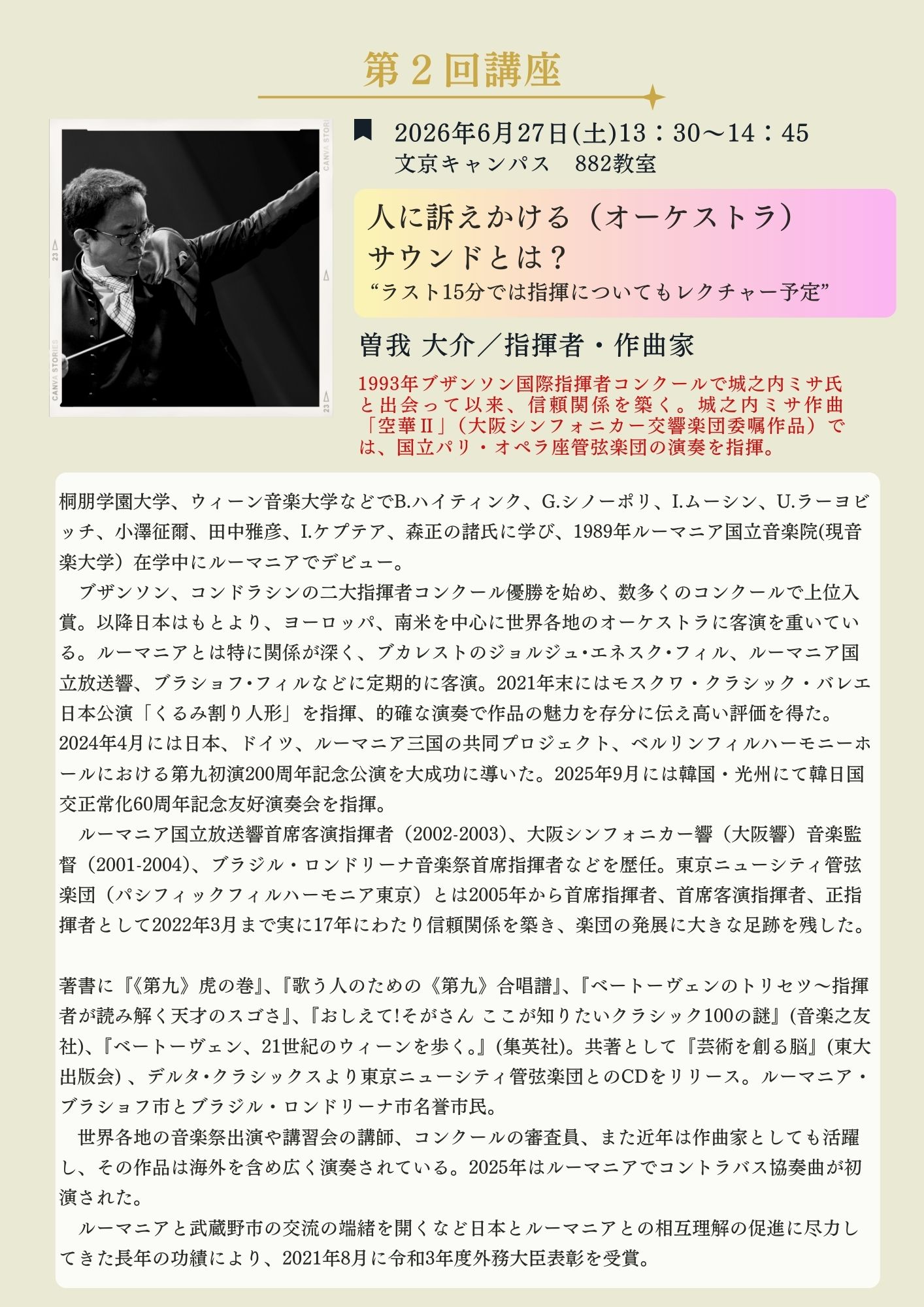 6月27日(土) 「人に訴えかける(オーケストラ)サウンドとは?」 講師:曽我大介/指揮者・作曲 申込締切:6月24日(水) |