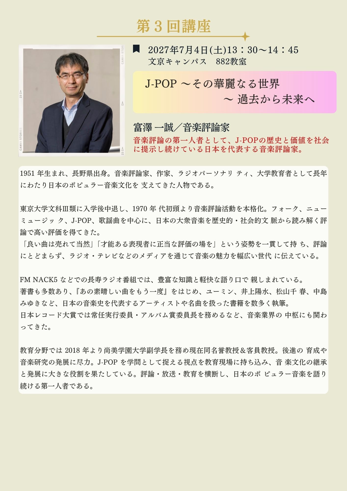 7月4日(土) 「Jpop〜その華麗なる世界〜過去から未来へ」 講師:富澤一誠/音楽評論家 申込締切:7月1日(水) |