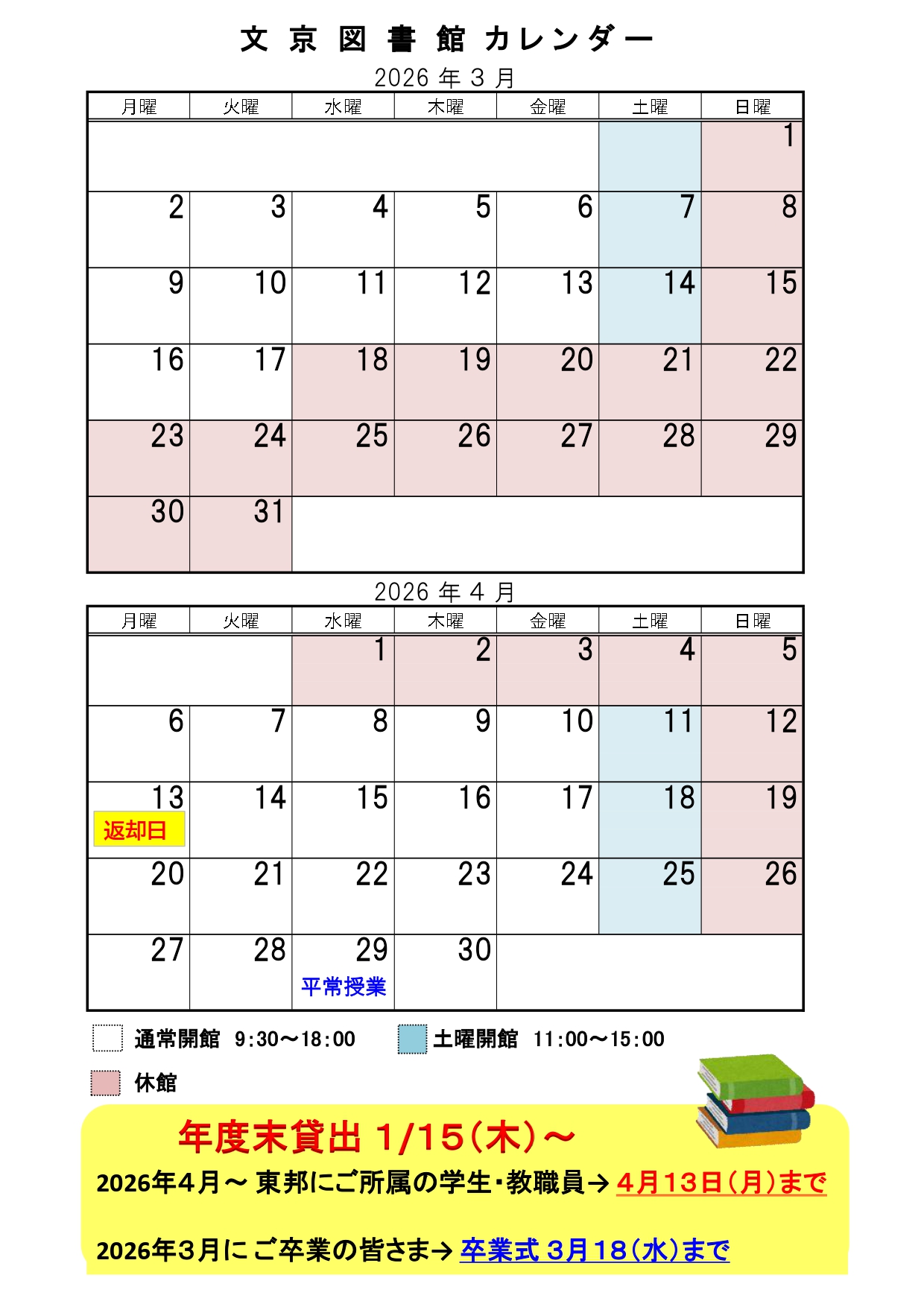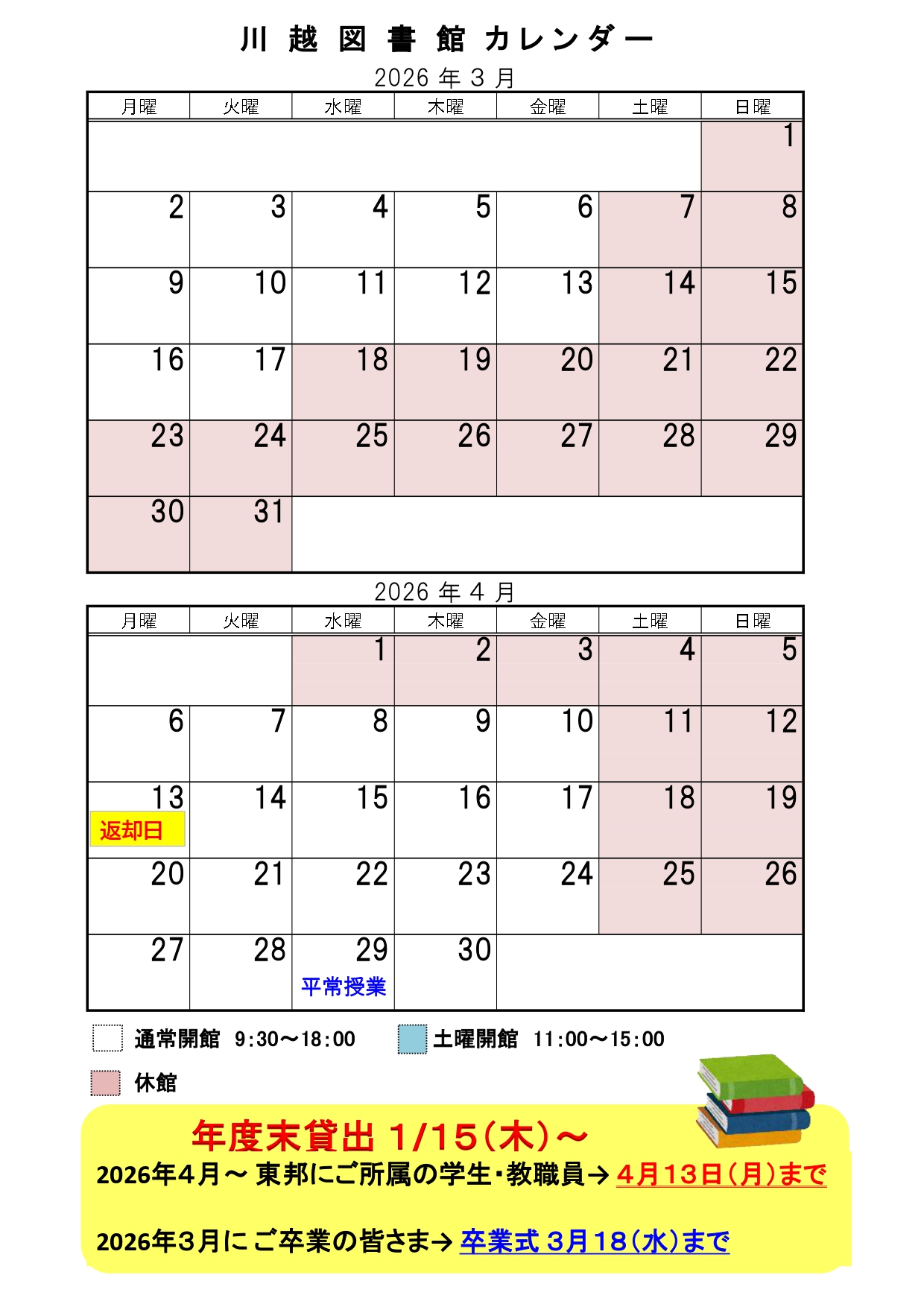 ※その他、短縮開館や臨時休館などは、カレンダーをご覧ください。 画像クリックで拡大。PDFデータを表示します。